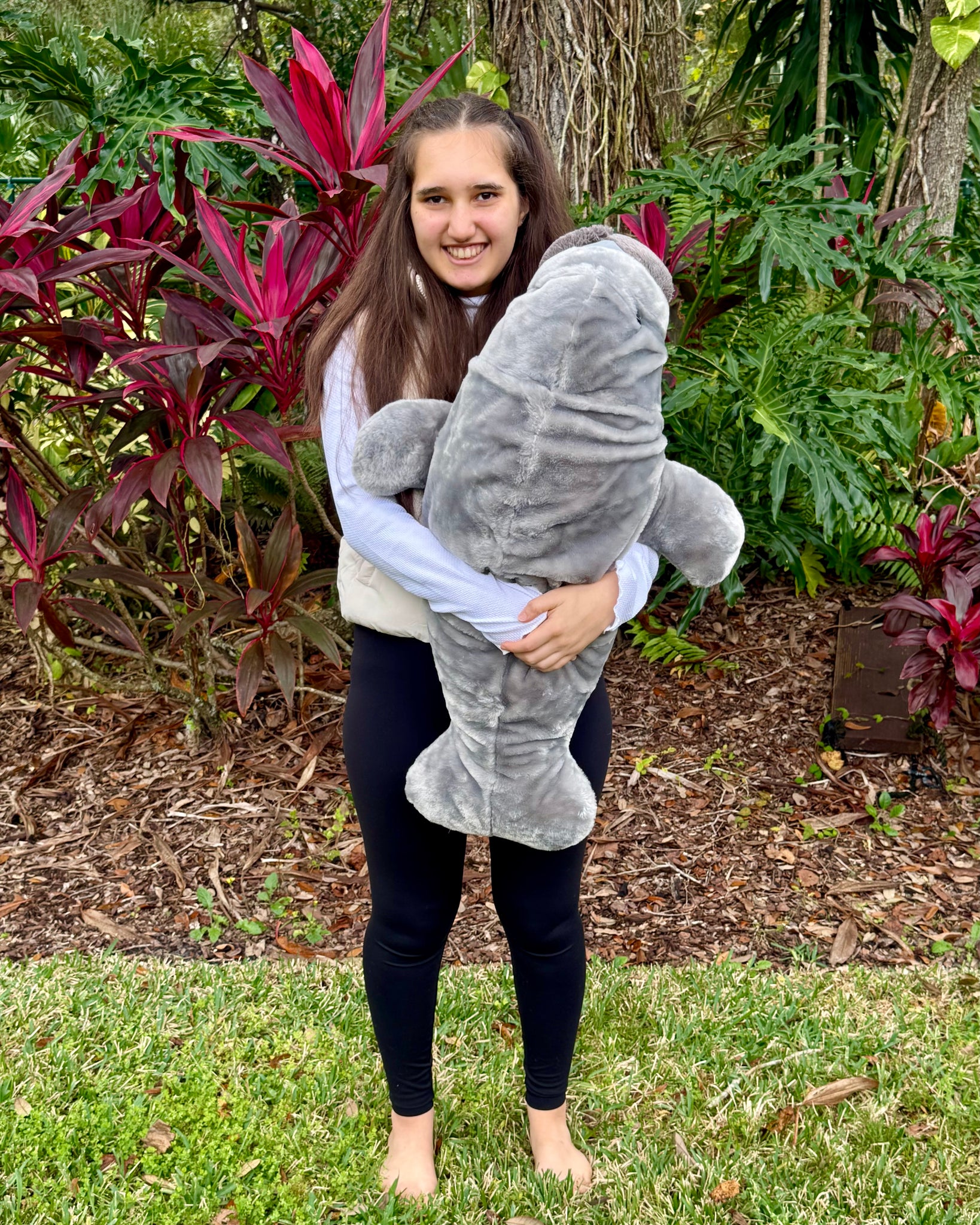 This super-soft manatee is fully weighted from nose to tail and in the flippers. At 32" long and 13" wide, the broad, low profile drapes across your lap or down your chest and body—or doubles as a squeezably soft pillow. Most adults enjoy 14–18 lbs; we can weight up to 22 lbs and still keep a comfy layer of fluff.