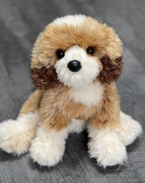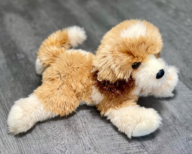 This baby-soft, floppy Goldendoodle is made for cuddles. At 15" in a relaxed lay-down pose, it’s the perfect lap or travel companion and comes weighted to 2.5 lbs with glass microbeads for a cozy, grounded feel.