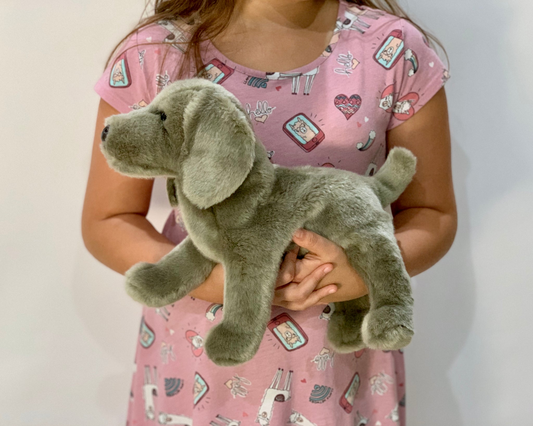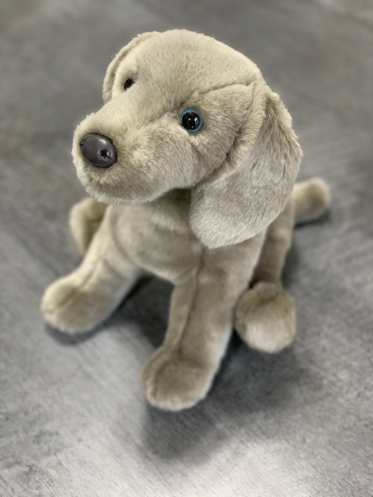 This soft, silver-gray Weimaraner is a cuddly lap buddy. At 15", it’s compact for home, school, or travel. Weighted at 2.5 lbs for a calm, grounded hug.