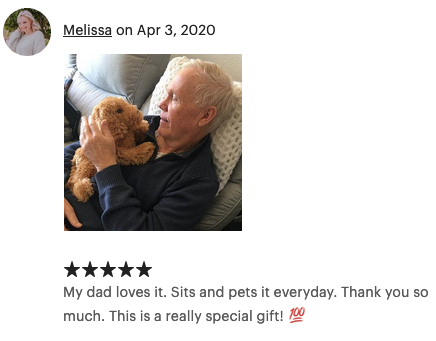 My mom was given one of these for Christmas by my son and daughter-in-law and even though she is not a huge dog lover she fell in love instantly. She lives alone and little Cuddles has become a wonderful companion. We were shocked that she instantly took to her new little doggie and keeps her by her side daily. What a most wonderful gift!