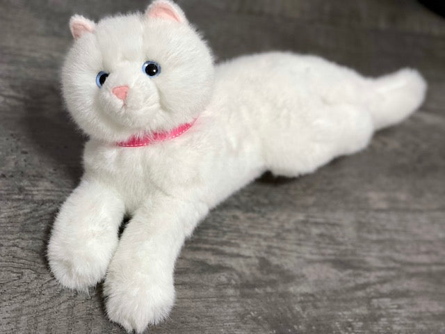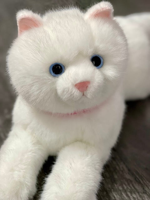 Meet your new comfort companion. This fluffy white cat looks and feels remarkably lifelike with velvety fur, a pink nose, and sweet blue eyes. At 15" from paw to paw, it’s the ideal size for your lap, chest, or cozy bedtime snuggles.