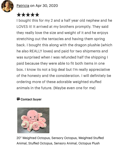 We place a casing of poly pellets and/or glass beads in the head only, so the weight is concentrated, making it feel heavy. We add a thin layer of poly fill around the casing for added softness. For young children, we recommend this small octopus at 1.5 to 2lbs. Up to 2yrs, chose 1.5lbs. For older children and adults, we recommend the maximum 3lbs.