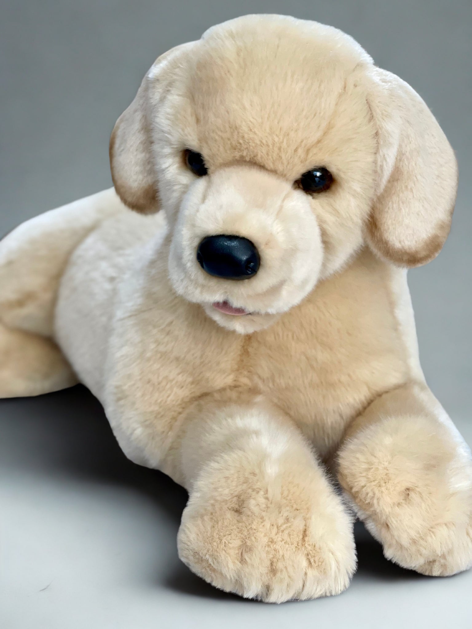 This lifelike yellow lab is soft, floppy, and irresistibly cuddly. At 35" paw-to-paw (≈ 28" body without hind legs), it rests naturally across your lap or chest. We can weight it up to 22 lbs; many adults enjoy 16–18 lbs for a cozy, grounded feel.