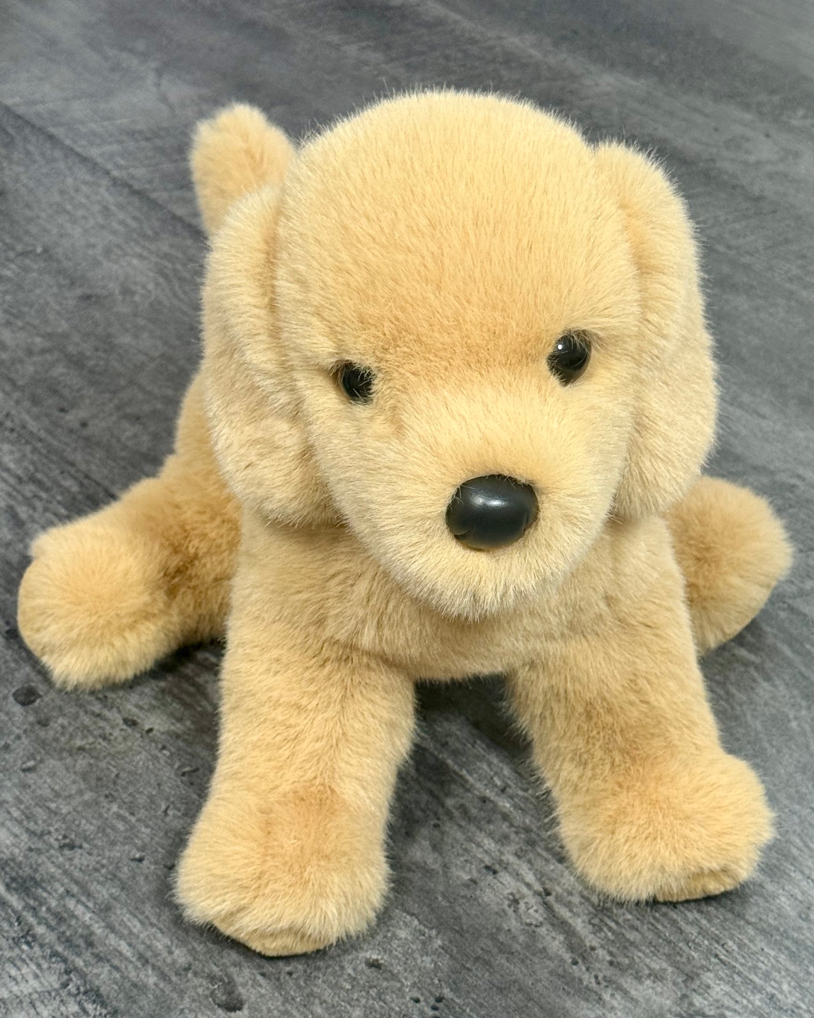 Meet your softest little lap buddy. This 15" golden retriever has an ultra plush coat, that is so satisfying to pet or snuggle with. Perfect for lap, desk, or on-the-go calm. Weighted up to 4 lbs with glass microbeads.