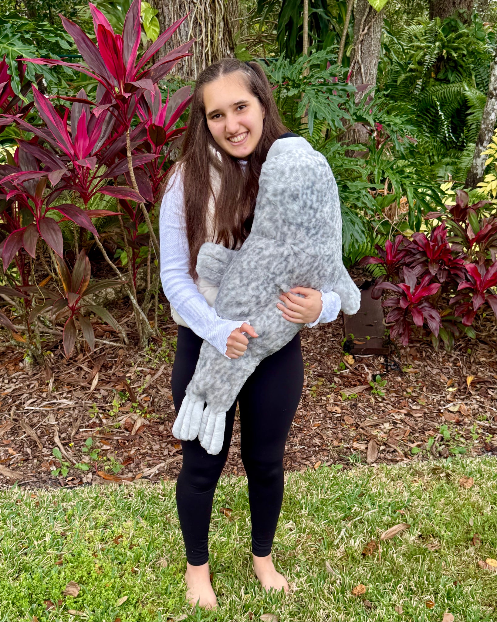 This super-soft harbor seal is fully weighted from nose to tail. At 32" long and 13" wide, the broad, low profile drapes across your lap or down your chest and body—or doubles as a squeezably soft pillow. Most adults enjoy 14–18 lbs.